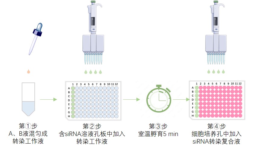 A、B液混合成轉(zhuǎn)染工作液后,可用多通道移液器批量進(jìn)行siRNA轉(zhuǎn)染復(fù)合物配制及加藥。