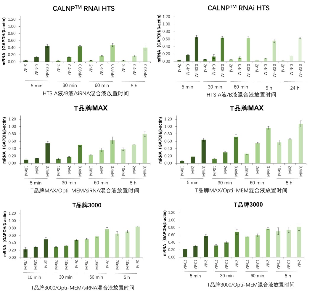 轉(zhuǎn)染工作液和siRNA轉(zhuǎn)染復(fù)合液在長(zhǎng)時(shí)間放置的情況下,轉(zhuǎn)染效率無(wú)顯著變化,確保高通量序列篩選實(shí)驗(yàn)中,前后配液的序列不因轉(zhuǎn)染試劑穩(wěn)定性導(dǎo)致序列效率差異,避免遺漏高效率序列。