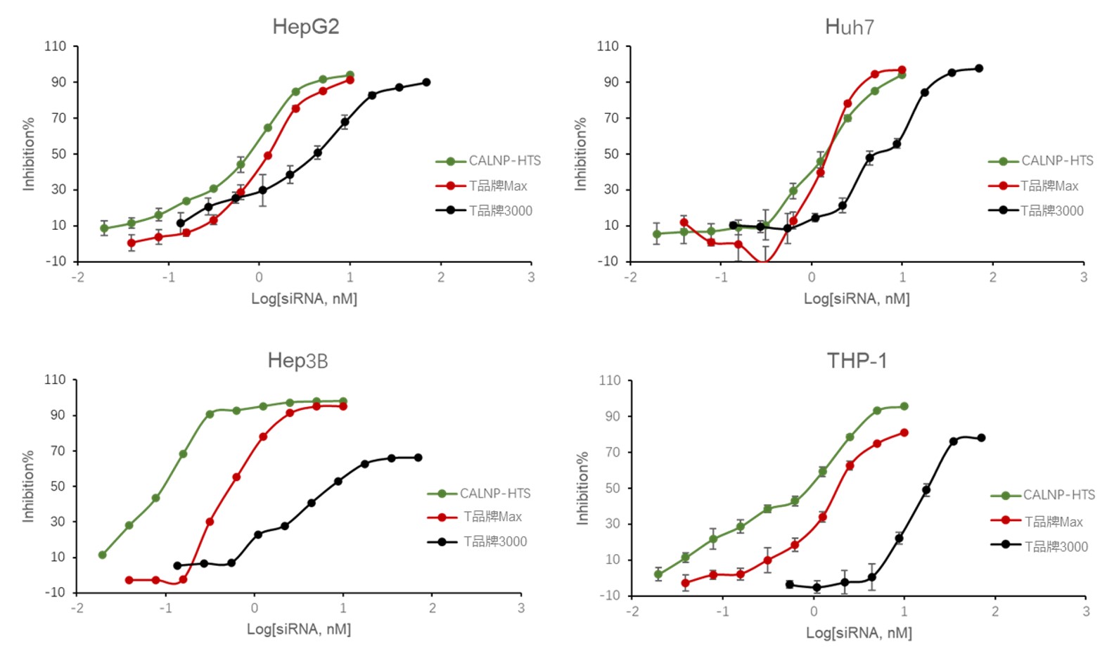 本試劑轉(zhuǎn)染siRNA具有超高的靶基因敲低水平,在多種細(xì)胞上靶基因抑制水平均達(dá)到或大幅度優(yōu)于國(guó)際領(lǐng)先試劑品牌水平。