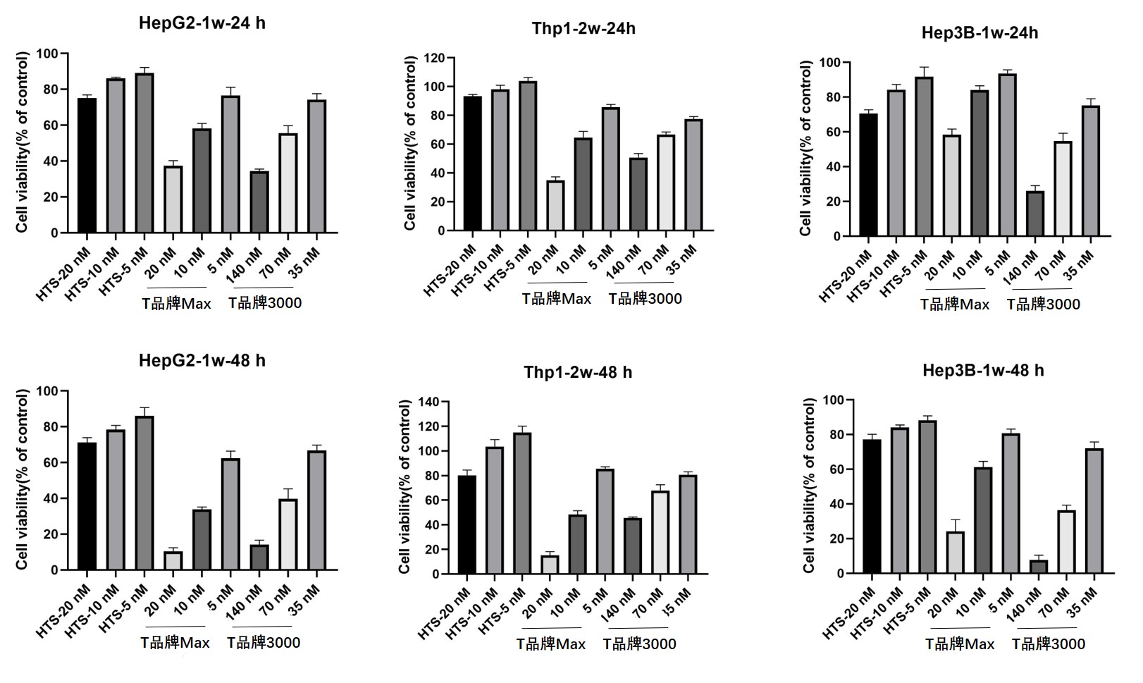 本試劑在實(shí)現(xiàn)超高的靶基因抑制水平同時(shí),具有極低的細(xì)胞毒性,在轉(zhuǎn)染試劑推薦使用濃度的上下2倍范圍內(nèi)測(cè)試,不同細(xì)胞上均維持良好的細(xì)胞活力。